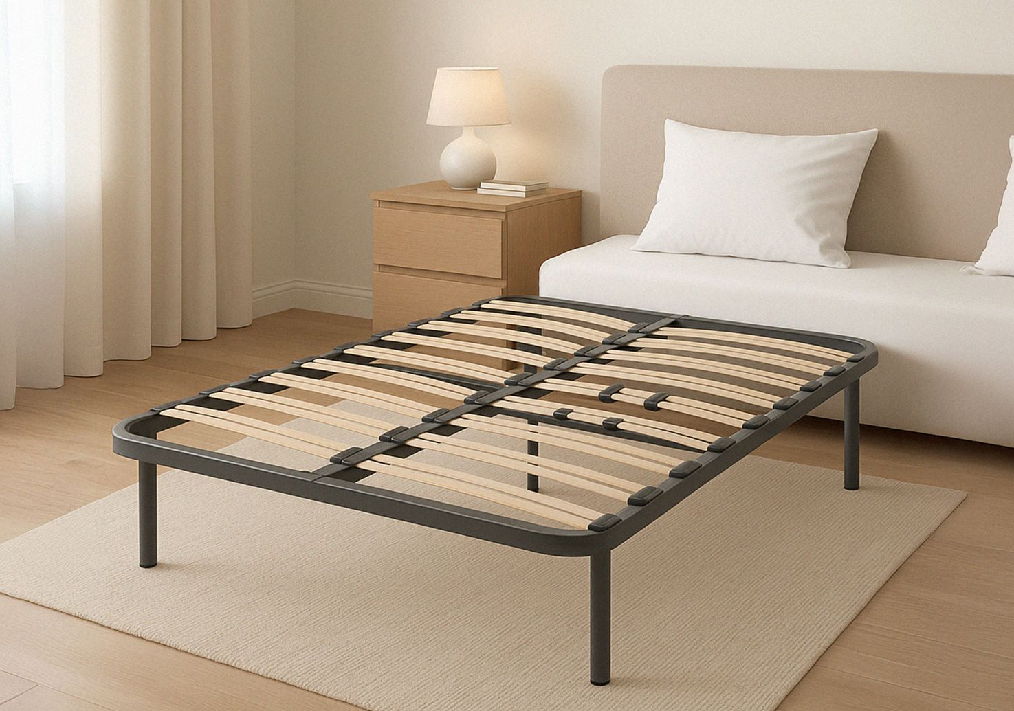 O Estrado Multilâminas Reforçado é uma base de cama ergonómica com estrutura metálica de alta resistência e lâminas de madeira de faia flexível, concebida para melhorar a postura, a ventilação do colchão e a qualidade do sono. Ideal para colchões viscoelásticos, de látex ou espumação moderna, garante um descanso mais estável, confortável e duradouro.