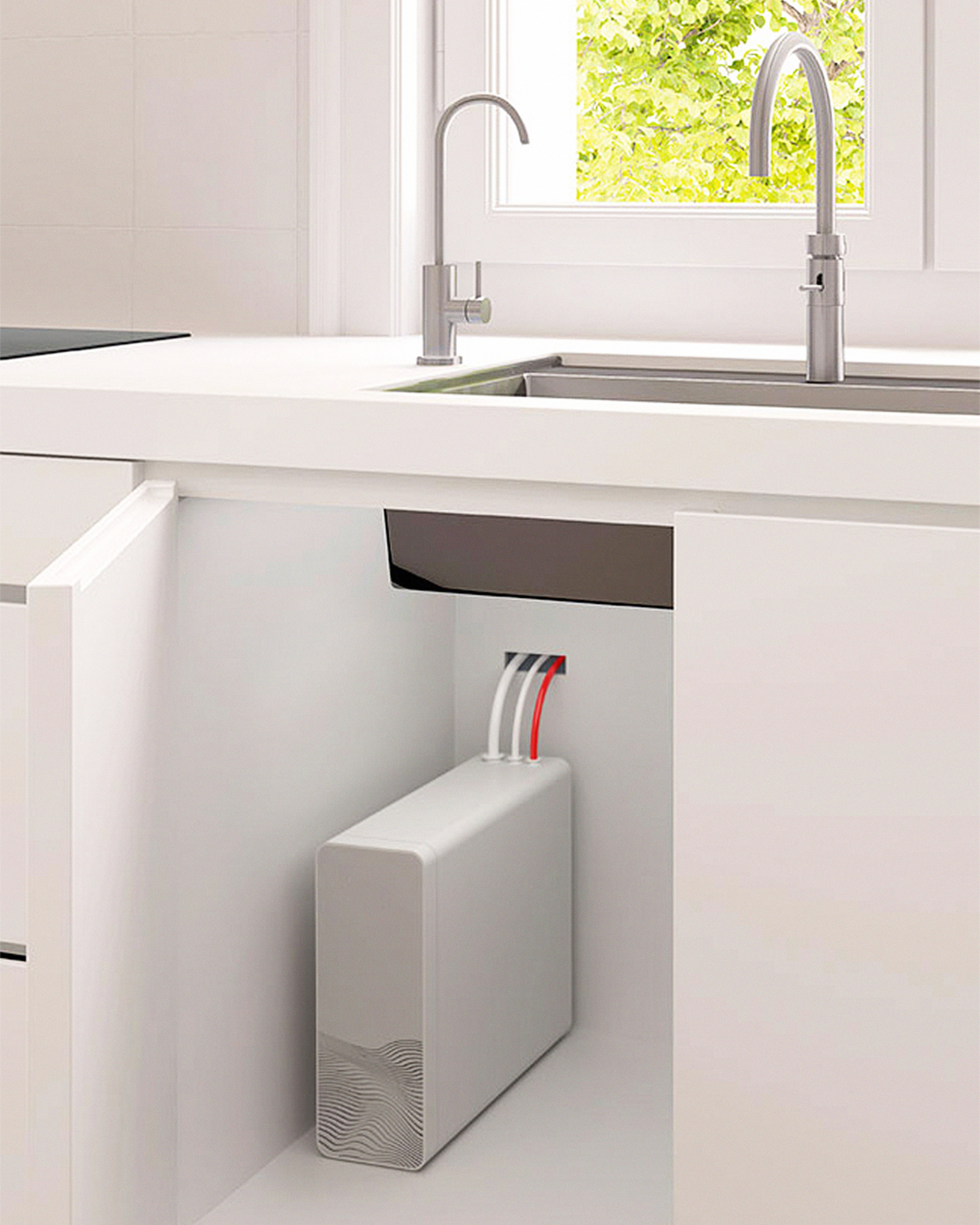A válvula cerâmica assegura um funcionamento silencioso, estável e seguro. O design compacto e discreto permite instalar o MonoiPure de forma integrada na cozinha, sem ocupar muito espaço. Ao reduzir significativamente a necessidade de água engarrafada, este sistema contribui também para diminuir o consumo de plástico e o impacto ambiental associado ao transporte e armazenamento de garrafas.