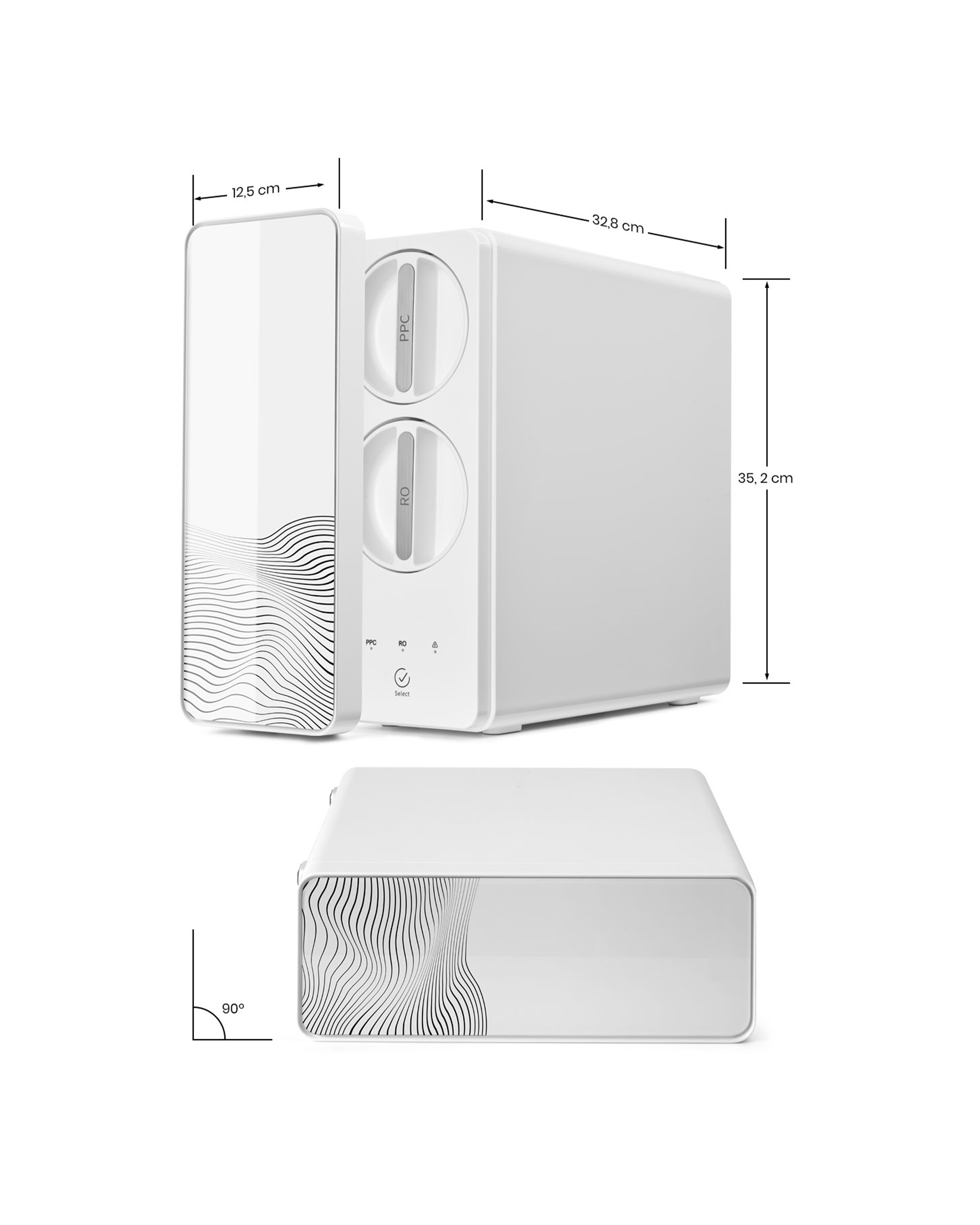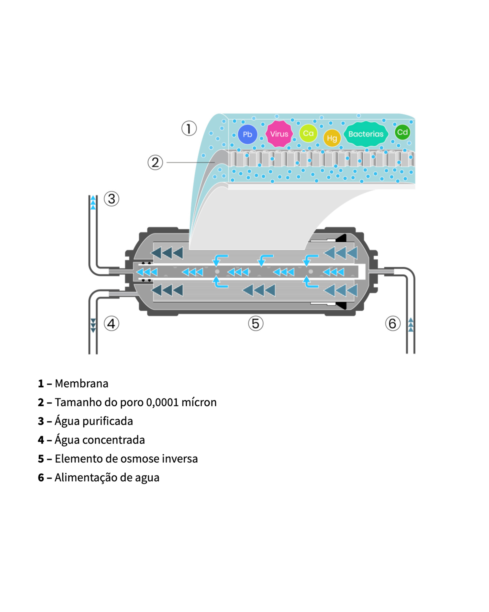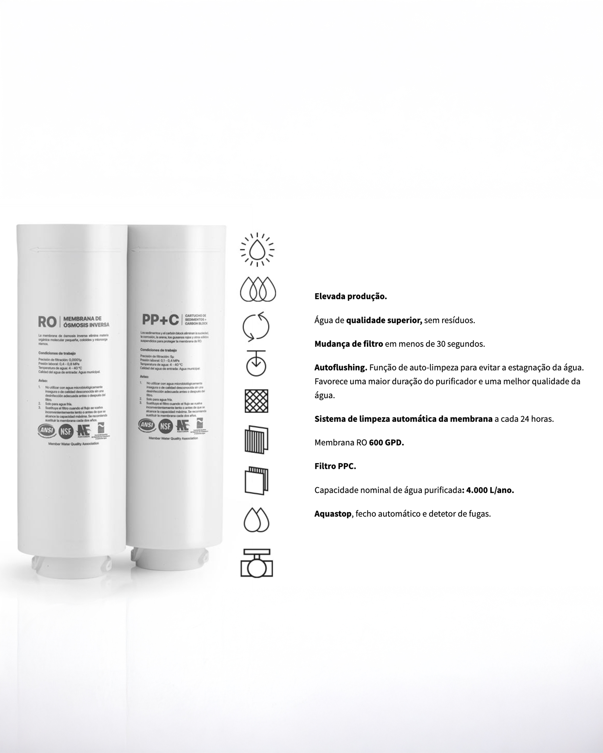 Este sistema utiliza tecnologia de osmose inversa combinada com filtro PPC para filtrar a água em profundidade, reduzindo de forma muito significativa contaminantes como chumbo, mercúrio, pesticidas, cloro, calcário, micro-organismos e partículas em suspensão. O resultado é uma água mais leve, segura e agradável ao paladar, ideal para beber, cozinhar ou preparar bebidas quentes.