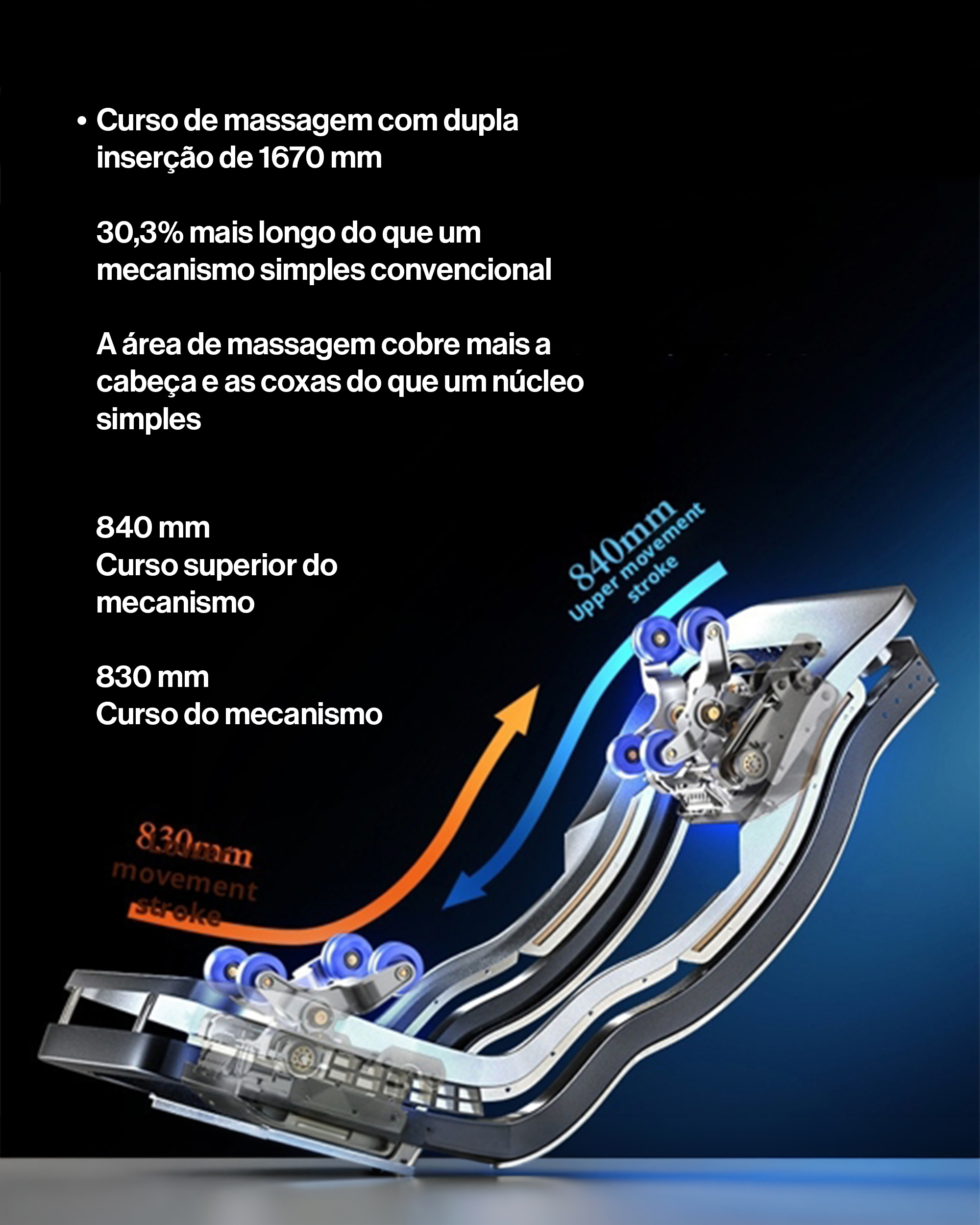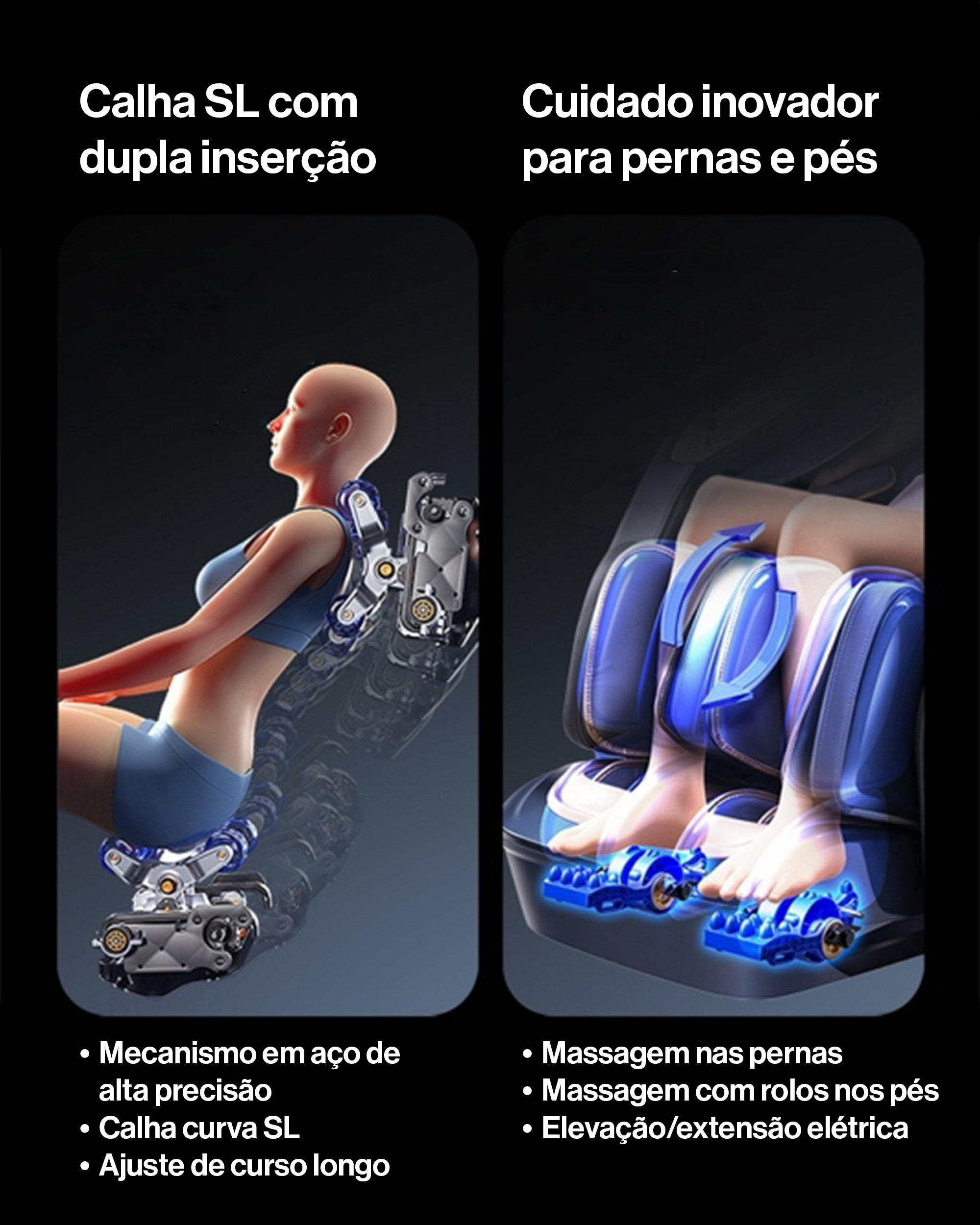 Um dos seus principais diferenciais é o sistema de gravidade zero, concebido para colocar o corpo numa posição mais reclinada e confortável, reduzindo a pressão sobre a coluna e favorecendo uma sensação global de leveza. O modelo inclui ainda massagem de pés, aquecimento nas costas, vibração, manipulação 4D, controlo inteligente por voz e massagem em trilho SL, combinação muito procurada por quem pesquisa por termos como poltrona de massagem zero gravity, cadeirão de massagem com aquecimento, massage chair full body ou poltrona de massagem com Bluetooth.